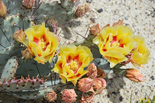 Description: Small, rounded, quarter size pads form low spreading mats. Flowers yellow with red stamens, fading to orange late in the day.