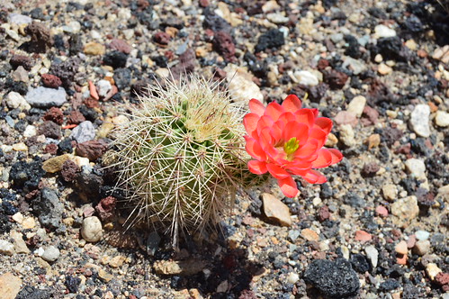Description: Ash gray needle spines on robust stems form dense clumps. Flowers bright red with yellow centers.