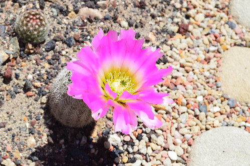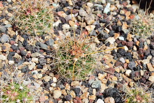 Description: Thick needle spines on tight clumps. This form exhibits both male & female flower characteristics with males being nearly double in size and often multicolored while the females are smaller with bright pinkish red colors and have underdeveloped stigmas and lack pollen, as pictured.